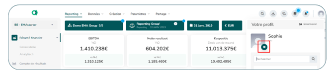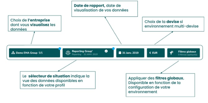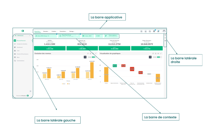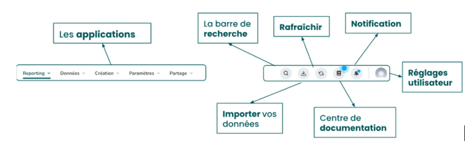 La barre applicative se trouve sur la partie supérieure de votre écran. Elle est accessible que vous soyez sur votre Reporting ou sur n'importe quelle page de votre environnement. Elle peut être divisée en deux parties :