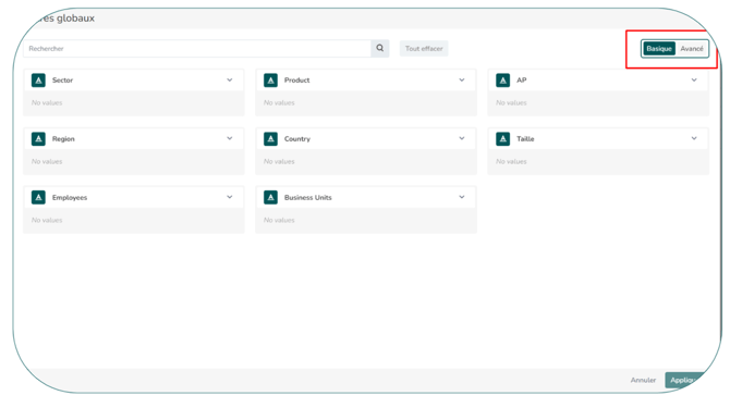 Les filtres disponibles se basent sur vos analytiques et ils existent deux modes pour l'utilisation des filtres : basique et avancé.